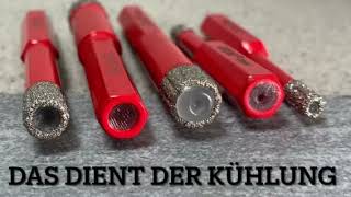 Der Diamantbohrer kann trocken angewendet werden. Zwischenzeitliches Abkühlen im Wasser erhöht die Lebensdauer erheblich.