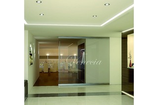 für ESG-Ganzglas-Schiebetüren, Glasfixierung durch Klemmen ohne Glasbearbeitung System: Designlaufschiene, Wandmontag...