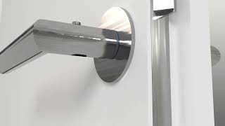 Garnitur bestehend aus: Drückerpaar festdrehbar gelagert auf Edelstahlrosette 54/2 mm mit integrierter Hochhaltefeder, im Griff integrierte einseitige Verriegelungsmechanik mit Notentriegelung, Verbindungsstift und Befestigungsmaterial, mit Besetztanzeige